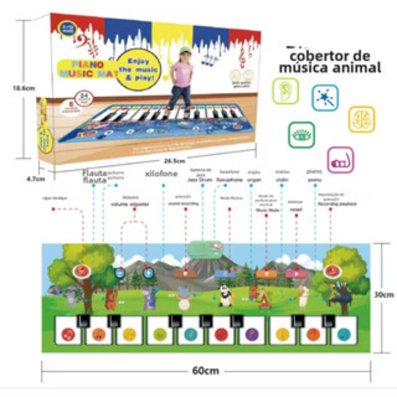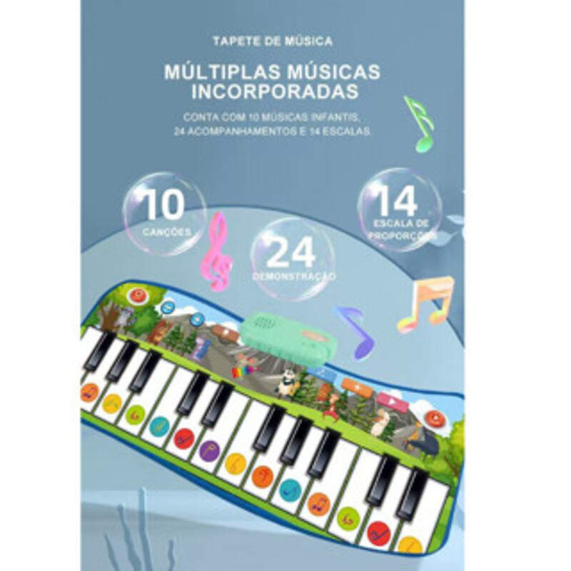 Itens inclusos: - 1 x Tapete/Teclado Musical. ATENÇÃO: - O produto contém peças pequenas, recomendado para crianças maiores de 3 anos; - Pilhas NÃO inclusas. Tamanho e peso aproximados: - Tamanho da embalagem: 23 x 37 x 5,5 cm; - Tamanho do teclado: Modelo 6803-1: 60 x 30 cm; - Dimensões do teclado: Modelo 6803-2: 110 x 36 cm;