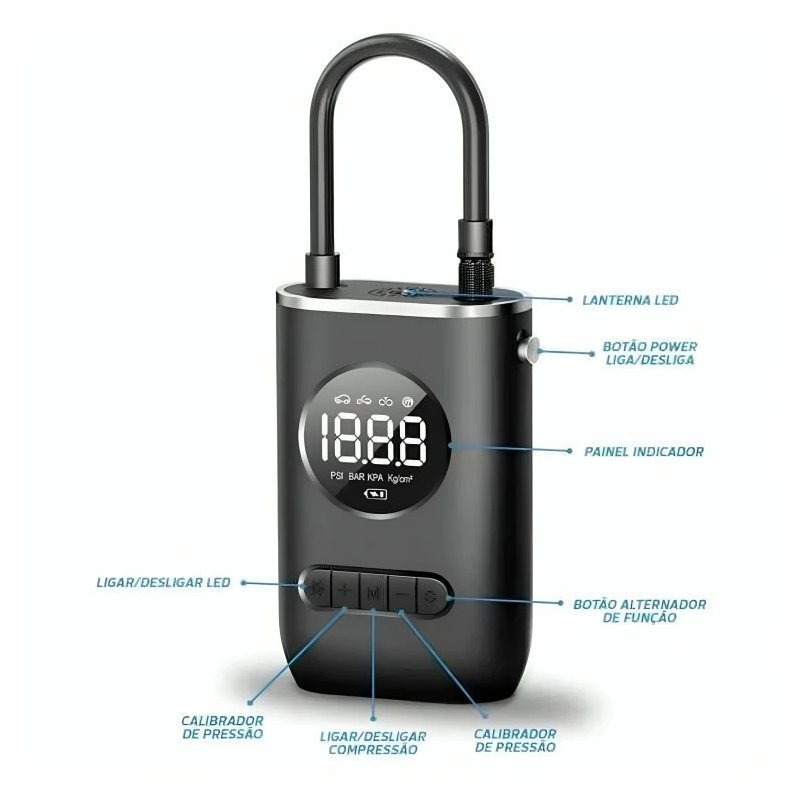 Compatibilidade Universal: Compatível com carros, motocicletas, bicicletas e outros infláveis, esta bomba de ar é versátil e prática. Alimentação USB: Carregue facilmente a bomba de ar usando um cabo USB, seja em um computador, carregador de parede ou carregador de carro. Medição em diferentes unidades: A bomba de ar pode ser configurada para medir a pressão dos pneus em PSI, BAR, KPA ou KG/CM², de acordo com sua preferência. Luz LED integrada: Uma luz LED integrada fornece iluminação adicional em situações de pouca luz, tornando-a útil em emergências noturnas ou situações de reparo.![]()