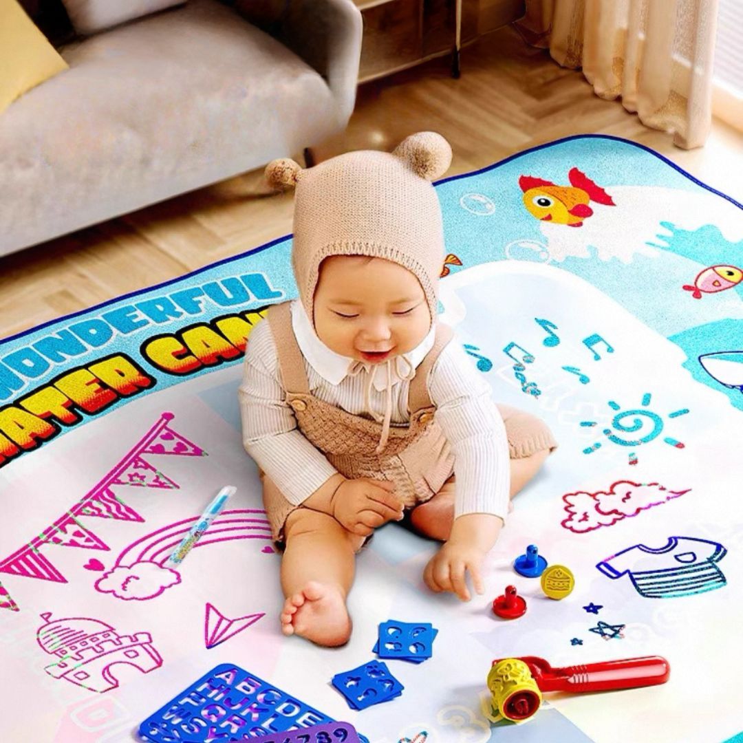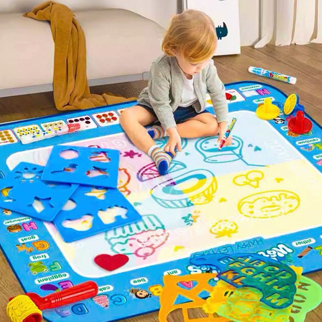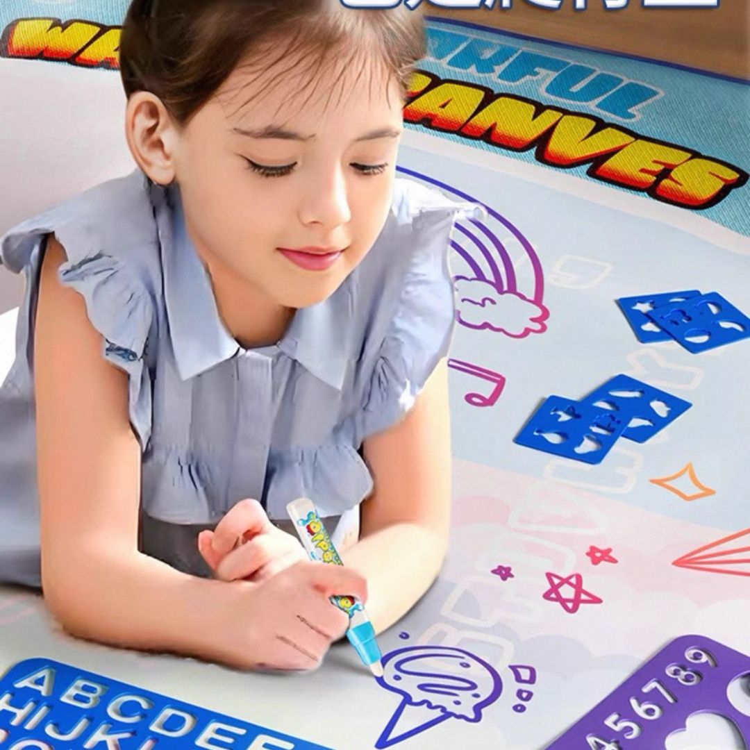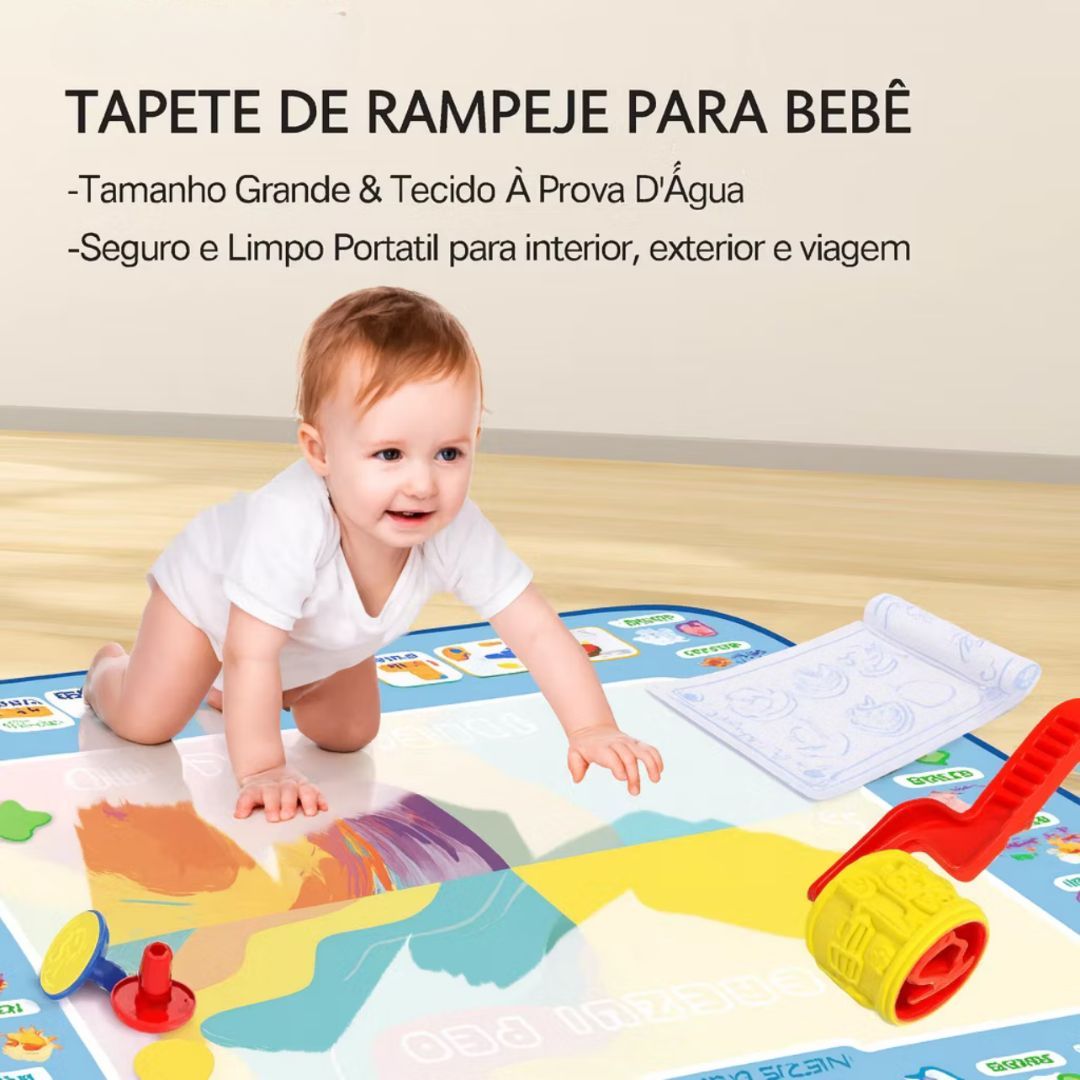 Tapete Mágico de Água - Um jogo que ganha vida com água! Chegou a maneira mais divertida e segura de deixar a imaginação das crianças correr solta! O Tapete Mágico de Água é perfeito para pequenos artistas que adoram desenhar e pintar - sem sujeira e sem tinta! Com apenas água, a mágica acontece: o tapete muda de cor e revela os desenhos como num passe de mágica.