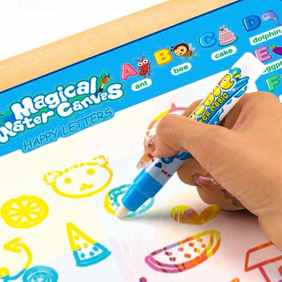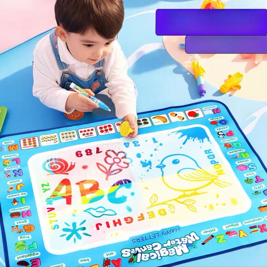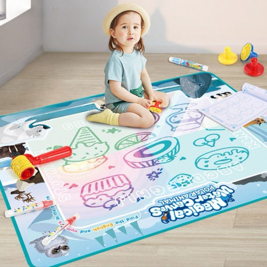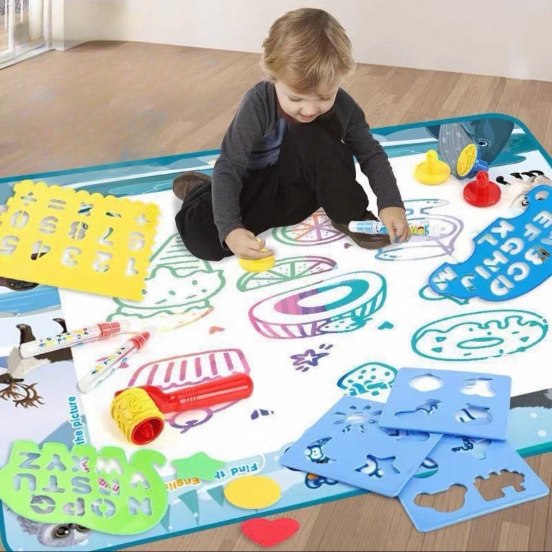 Tapete Mágico de Água - Um jogo que ganha vida com água! Chegou a maneira mais divertida e segura de deixar a imaginação das crianças correr solta! O Tapete Mágico de Água é perfeito para pequenos artistas que adoram desenhar e pintar - sem sujeira e sem tinta! Com apenas água, a mágica acontece: o tapete muda de cor e revela os desenhos como num passe de mágica.