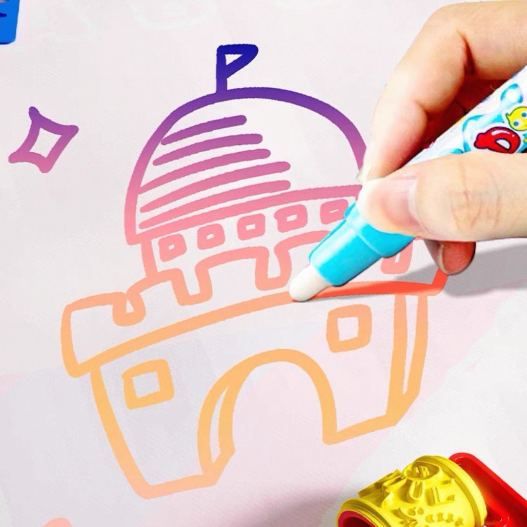 Cuidados e precauções: As canetas mágicas devem ser recarregadas apenas com água. Não adicione sabão, tinta ou outros líquidos. Mantenha longe de altas temperaturas. Após o uso, deixe o produto secar completamente antes de guardar. Armazene em local seco e adequado. Use sob a supervisão de um adulto. Um presente criativo que as crianças vão adorar!